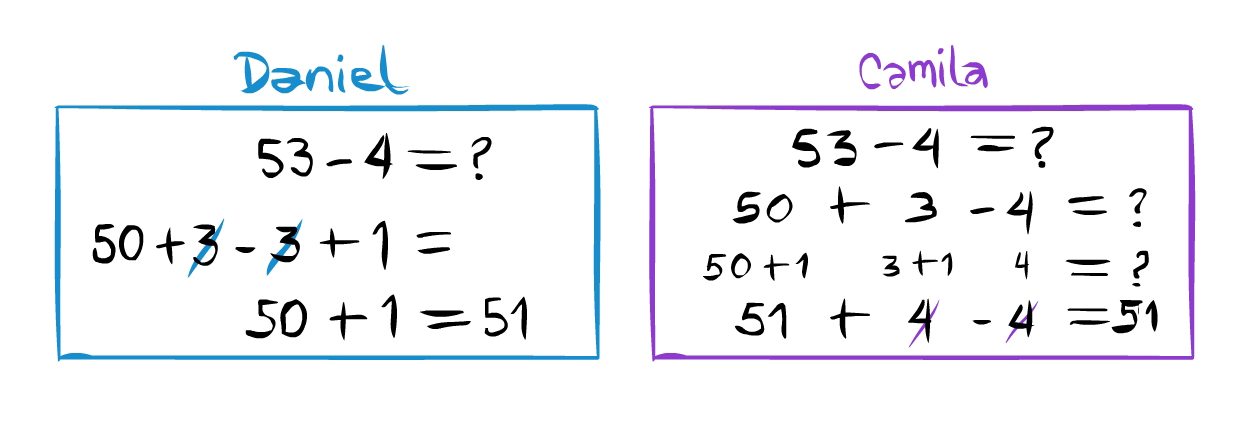 Luego de estudiar las estrategias para resolver ejercicios de adición y sustracción, la maestra propone un ejercicio a sus estudiantes. Daniel y Camila llegaron al mismo resultado. En la figura, mostramos lo que hicieron. ¿Cuál es el error en cada procedimiento?