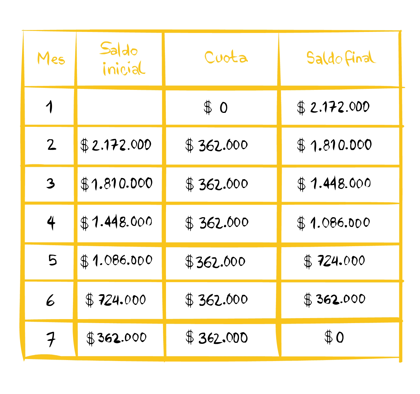 Mediante la tabla de la figura, el gerente de una corporación bancaria le explica a un cliente que, por el préstamo que le otorgó, pagará en total $2.172.000 que le va a cobrar en cuotas de $362.000 al iniciar cada mes. Para saber en cuántos meses hará pagos quien pide ese préstamo, ¿cuál significado de la división representa la tabla?