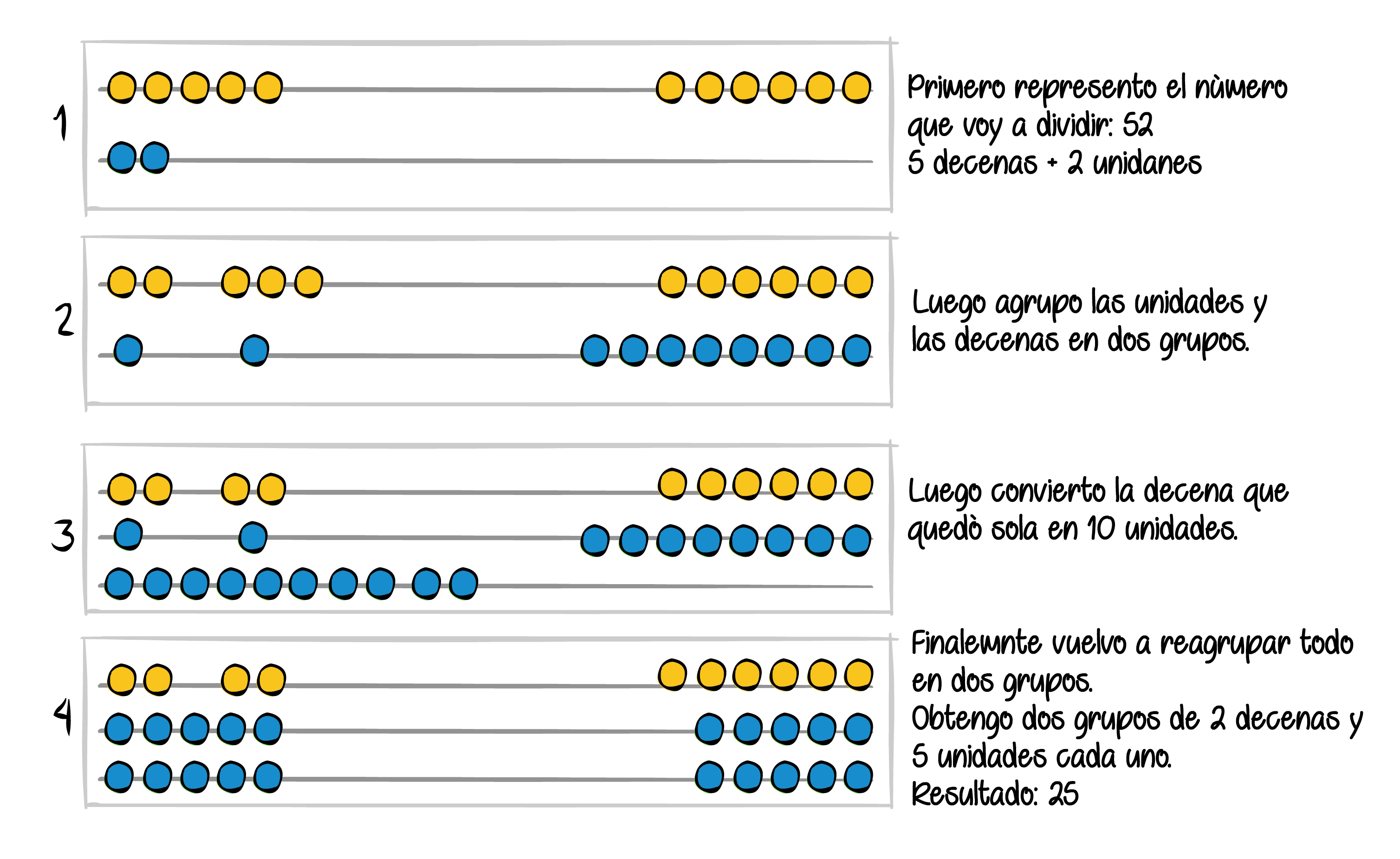 Utilizando un ábaco horizontal, Mateo expone a su clase la forma como resuelve 52:2 = 25. Observa la siguiente secuencia. Respecto al algoritmo que siguió Mateo, ¿por qué es incorrecto el resultado?