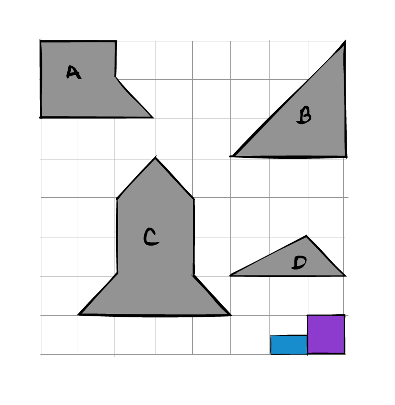 La maestra pide a sus estudiantes que calculen el área de las figuras A, B, C y D, utilizando como unidad de medida el cuadrado morado y el rectángulo azul (observa la figura). ¿Cuál medida no es correcta?