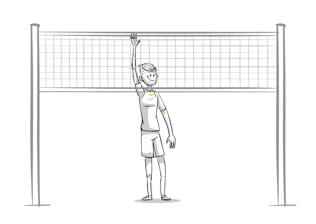 Un hombre de 170 cm de estatura alcanza el borde de la malla de voleibol cuando estira uno de sus brazos. ¿Aproximadamente a qué altura del suelo está la parte superior de la malla?
