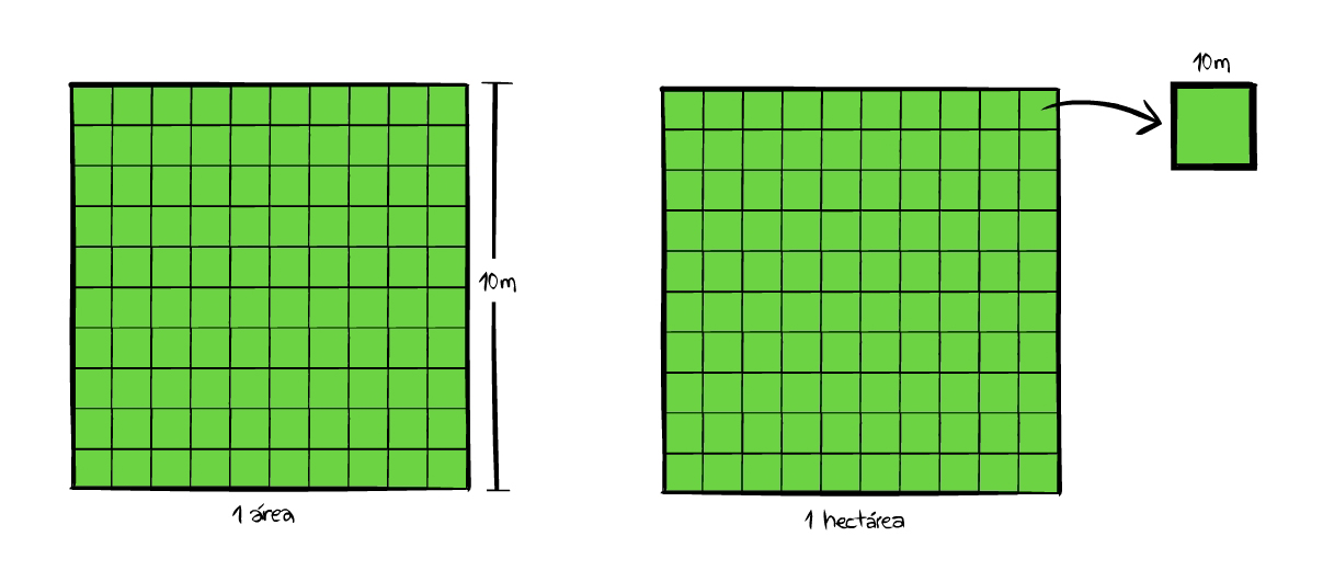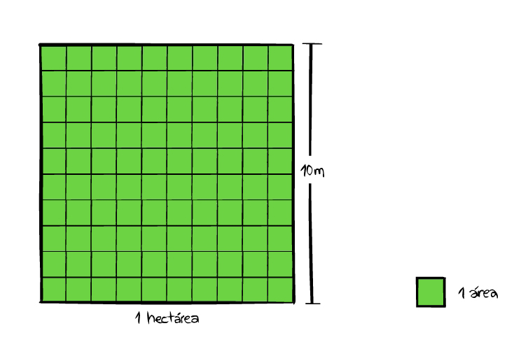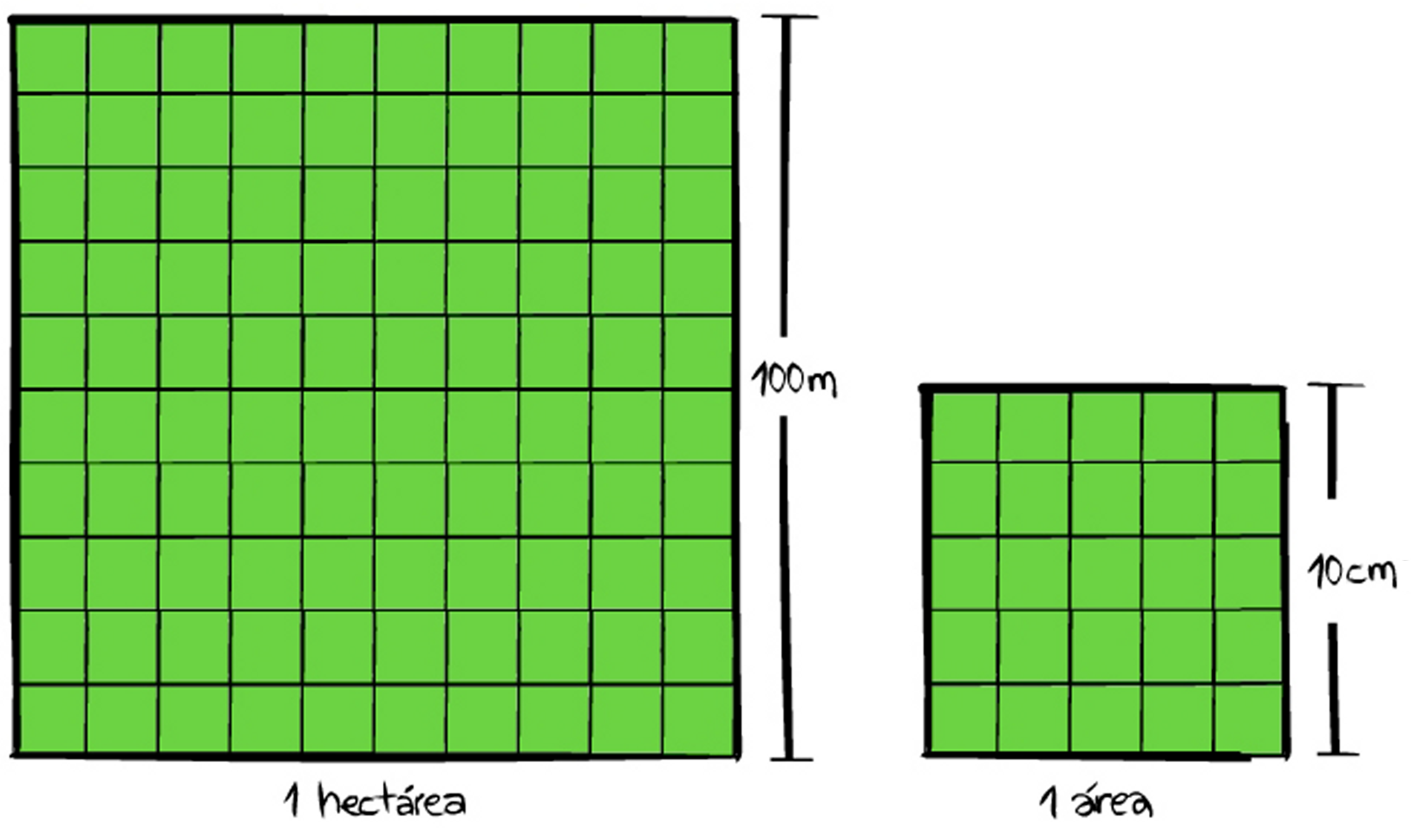 En algunas regiones es común medir terrenos en hectáreas y a veces en áreas. El equivalente a una hectárea es el hectómetro cuadrado, y el equivalente a 1 área es el decámetro cuadrado. De las siguientes representaciones, ¿cuáles corresponden a terrenos de 1 hectárea y 1 área?
